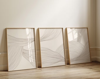 Deze driedelige canvasset combineert abstracte lijnen met zachte beigetinten en creëert zo een ruimte die zowel aards als open aanvoelt. Elke print is subtiel beïnvloed door de stijl van het midden van de vorige eeuw, waarbij organische rondingen samensmelten met geometrische helderheid. Samen vormen ze een compositie die uitnodigt tot rust en reflectie, zonder de aandacht op te eisen.
